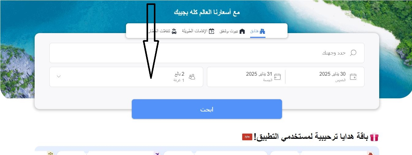 اضغط على الخانة المراد الحجز فيها سواء فنادق أو بيوت وشقق أو التنقلات.