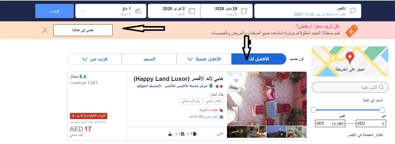 تظهر العديد من الخيارات الخاصة بالبيوت أو الفنادق أو غيرها، يتم اختيار الوجهة المحددة.