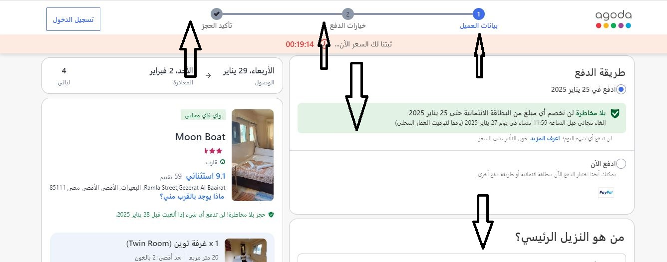 ادخل كافة البيانات المطلوبة ثم انتقل إلى اختيار خيارات الدفع ومعرفة التخفيضات التي تم وضعها على الحجز.