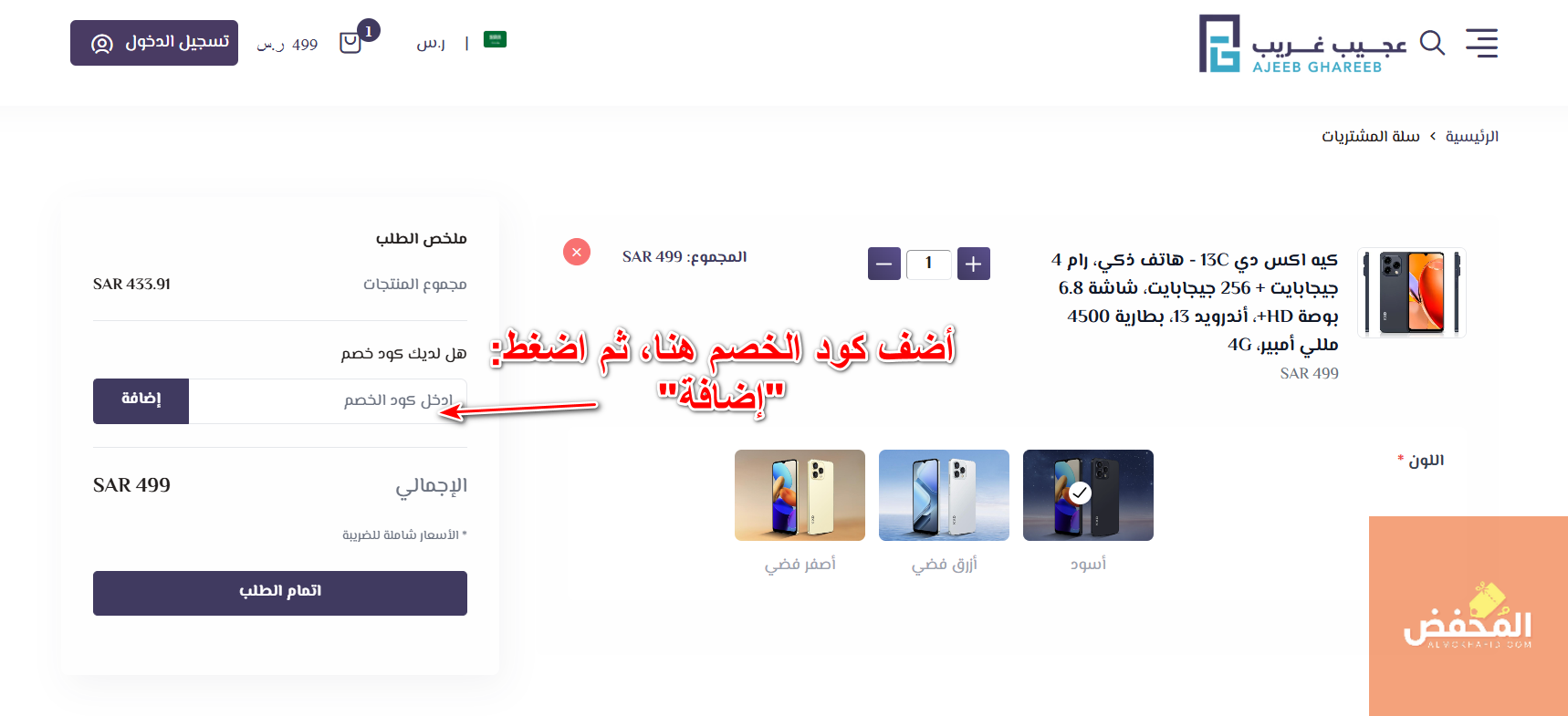 5- انسخ كود خصم عجيب غريب الإمارات 2025، ثم قم بلصقه في الخانة المحددة والمشار إليها بالسهم التالي، ثم اضغط “إضافة” حتى تتمكن من الحصول على الخصم المميز الذي يوفره الكود بشكل فوري وبدون تأخير.