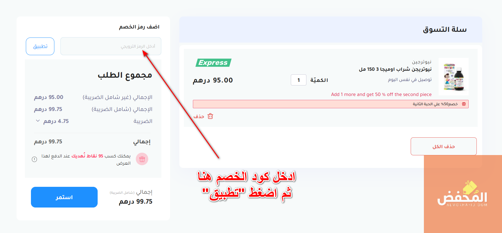 5- ادخل كود الخصم في الخانة المشار إليها بالسهم التالي، ثم اضغط على “تطبيق” للحصول على الخصومات التي يوفرها الكود بشكل فوري، وإتمام عملية الشراء بالخصومات المقررة.