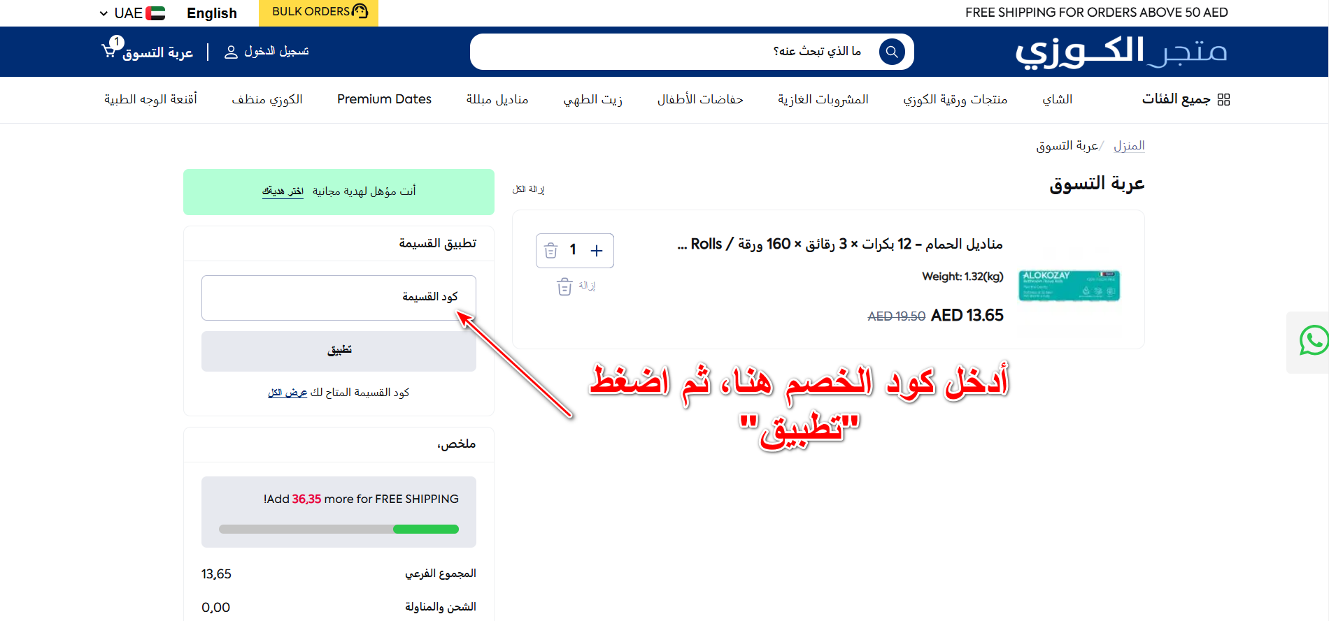 5- أدخل كود الخصم في الخانة المشار إليها بالسهم التالي، ثم اضغط “تطبيق” حتى تتمكن من الحصول على الخصم المميز الذي يوفره كود الخصم بشكل فوري.