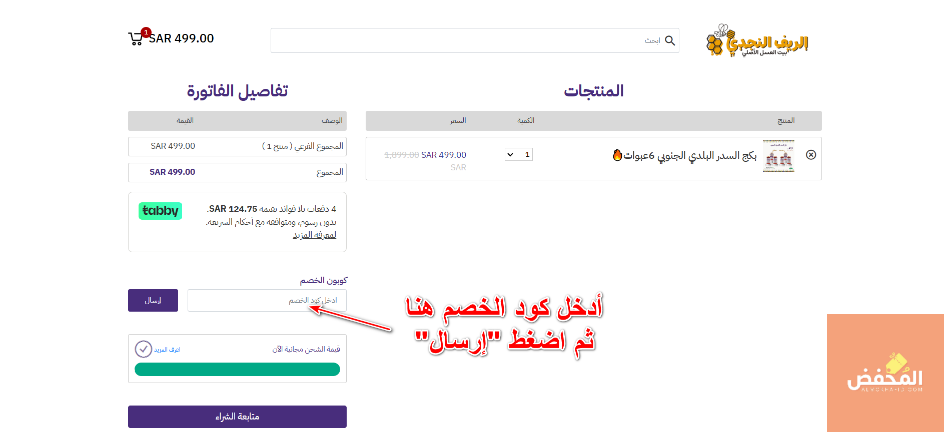 5- انسخ كود خصم الريف النجدي الإمارات 2025 والمعروض أعلى هذه المقالة، ثم قم بلصقه في الخانة المشار إليها، واضغط “إرسال” حتى تتمكن من الحصول على الخصم المميز الذي يوفره الكود بشكل فوري.