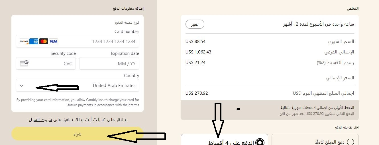 ثم انتقل إلى الدفع وتحديد وسيلة الدفع المناسبة لك ثم تفعيل عملية الشراء.