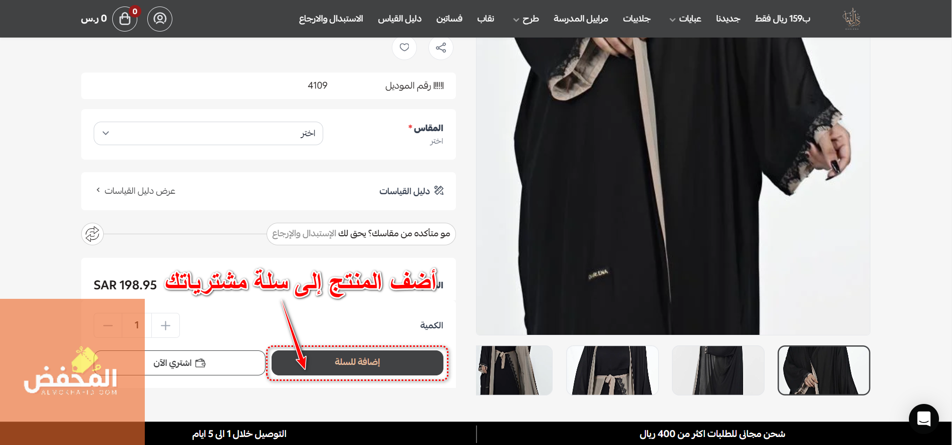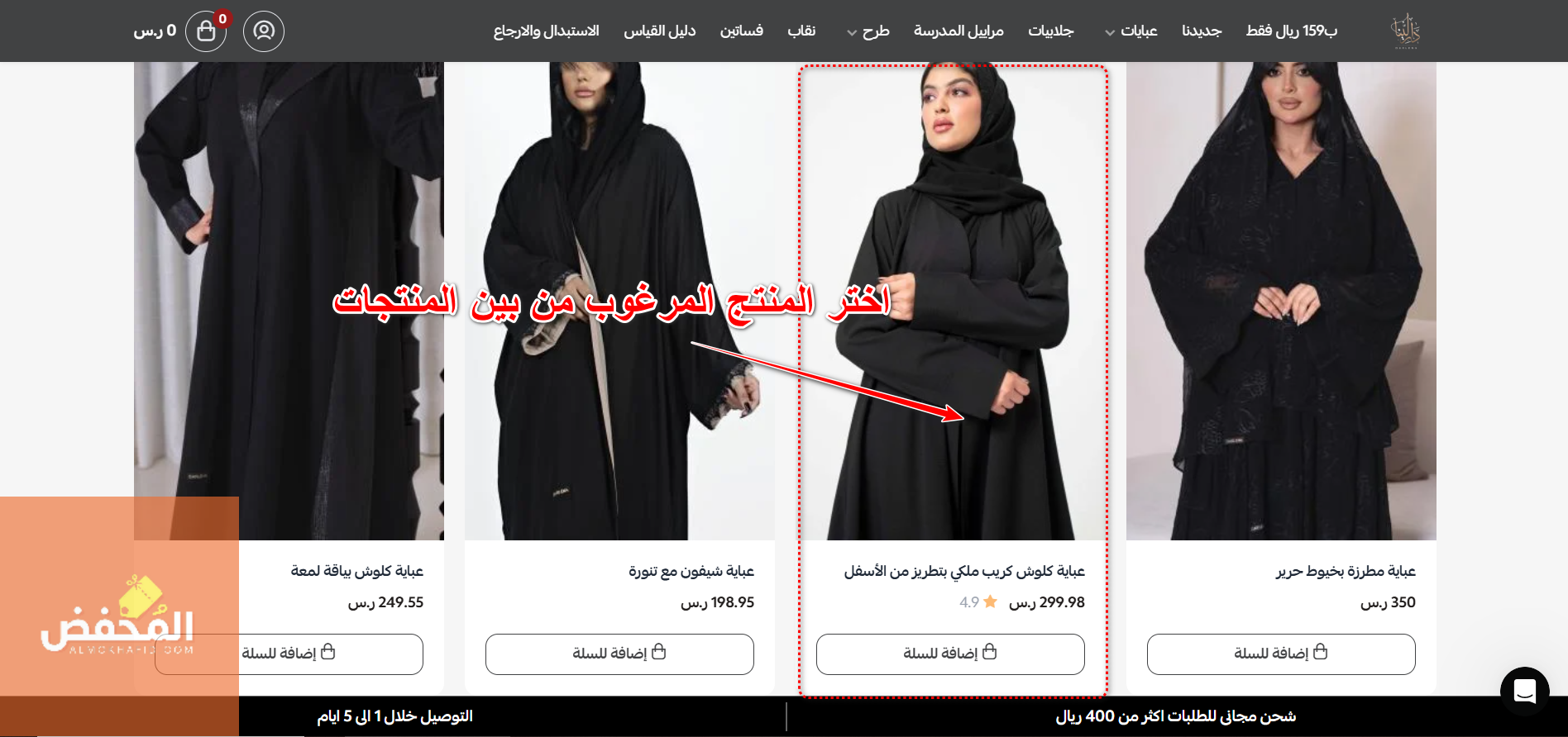4- أضف المنتج إلى سلة المشتريات الخاصة بك عن طريق الضغط على الأيقونة المشار إليها بالسهم في الصورة التالية، حتى تتمكن من إتمام عملية الشراء لاحقًا من خلال سلة مشترياتك.