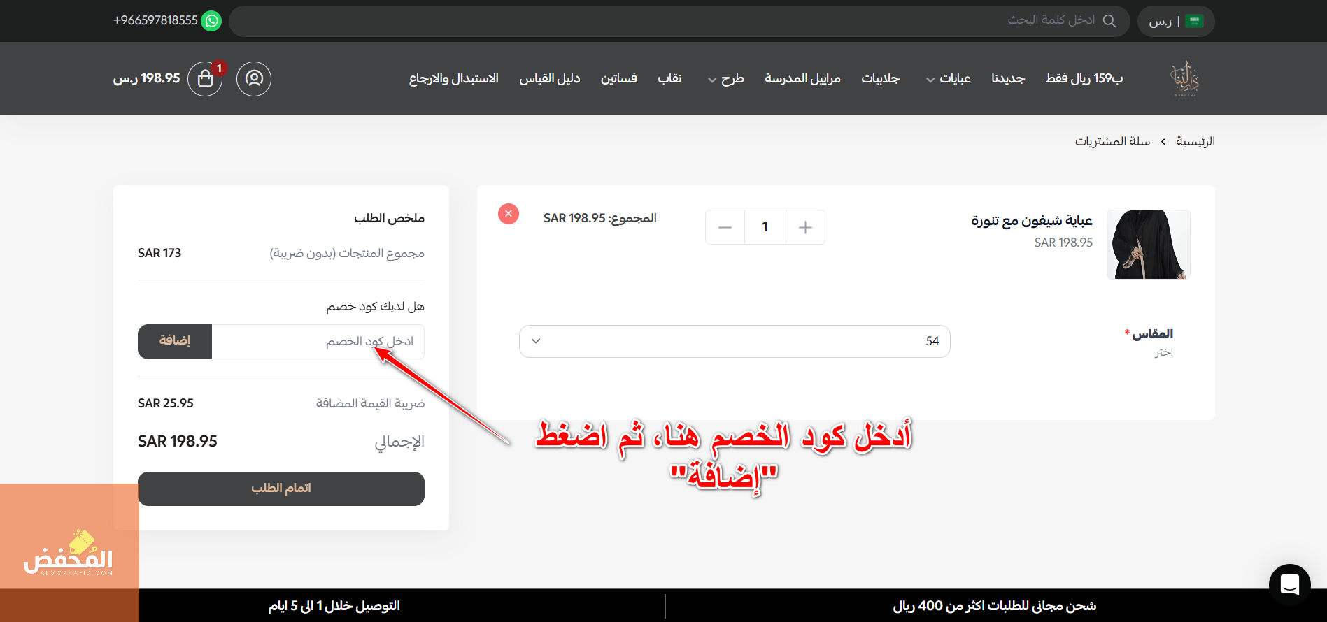 5- ادخل كود خصم دار لينا الإمارات في الخانة المحددة والمشار إليها بالسهم في الصورة التالية، ثم اضغط “إضافة” حتى تتمكن من الحصول على الخصومات التي يوفرها كود الخصم بشكل فوري.