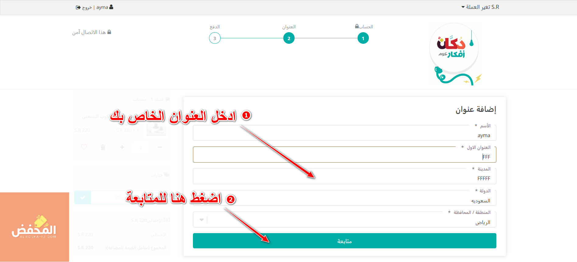 5- أدخل العنوان الخاص بك، ثم اضغط “متابعة” حتى تتمكن من الدخول إلى الصفحة التالية والتي تحتوي على الخانة المخصصة لكود الخصم حتى تتمكن من الحصول على الخصم المميز الذي يوفره الكود.