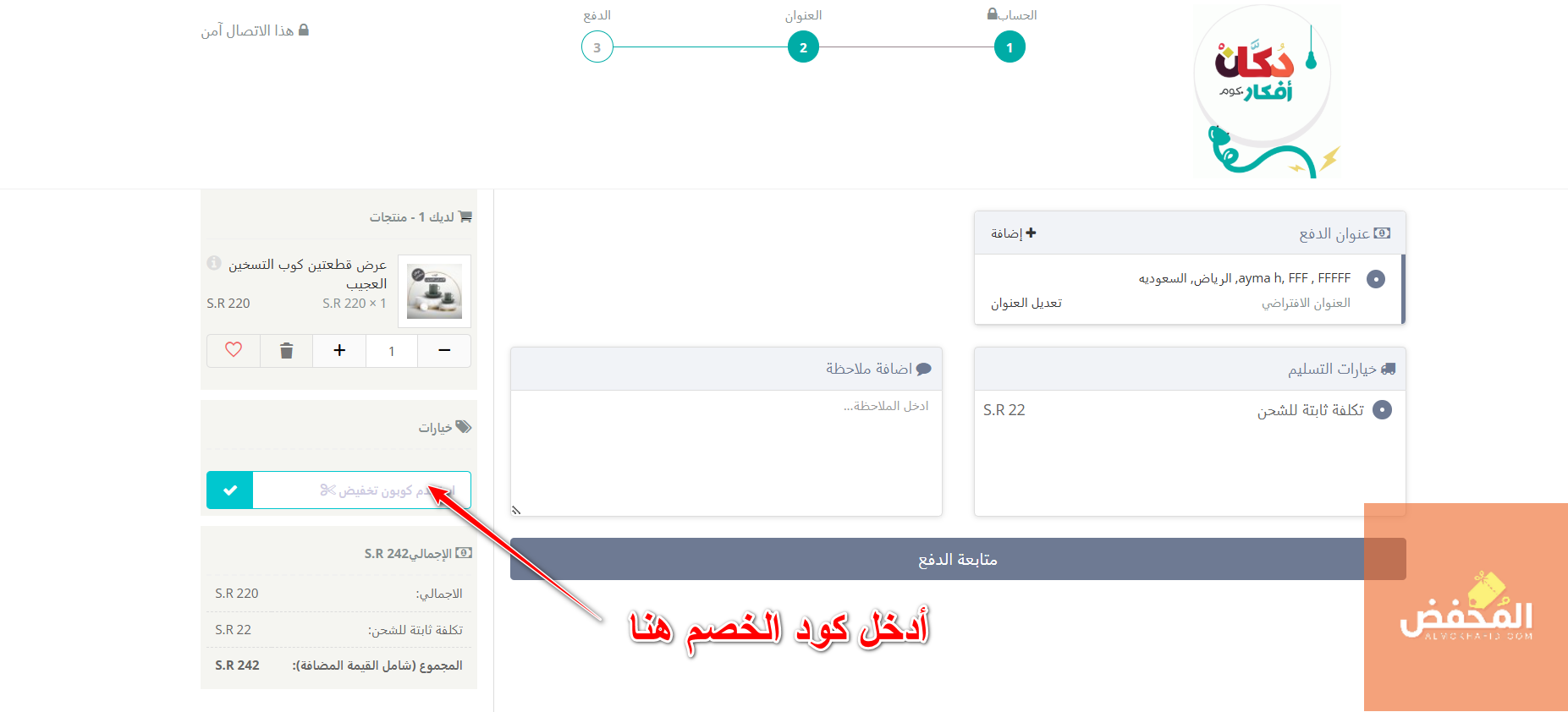 6- انسخ كود خصم دكان أفكار الإمارات، ثم قم بلصقه في الخانة المحددة والمشار إليها بالسهم، ثم قم بالضغط على علامة الصح المجاورة حتى تتمكن من تحصيل كود الخصم بشكل فوري.