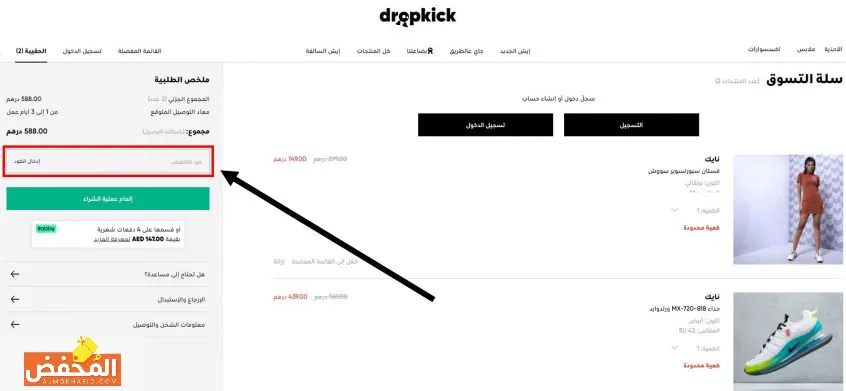 قم بإضافة كود الخصم الخاص بـ Dropkick في الخانة الخاصة به.