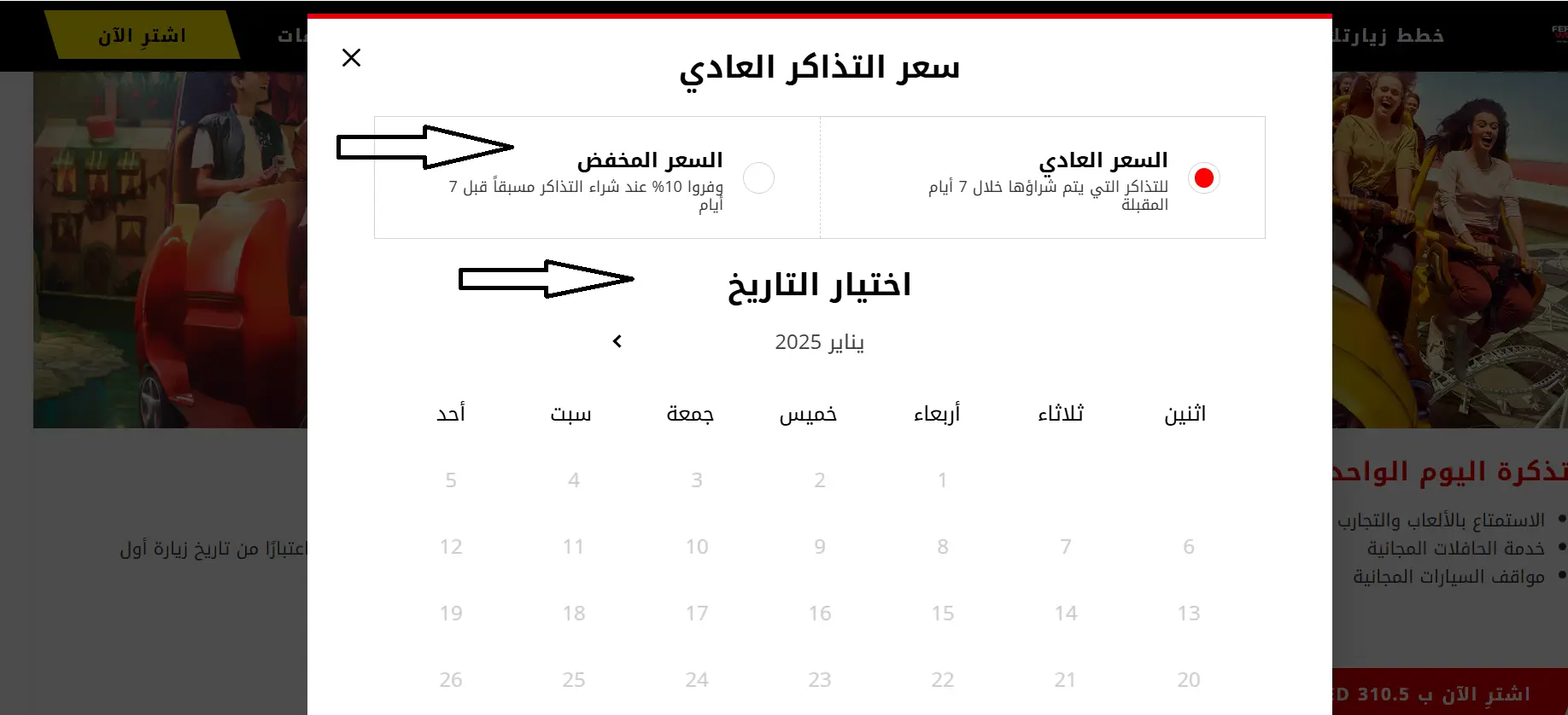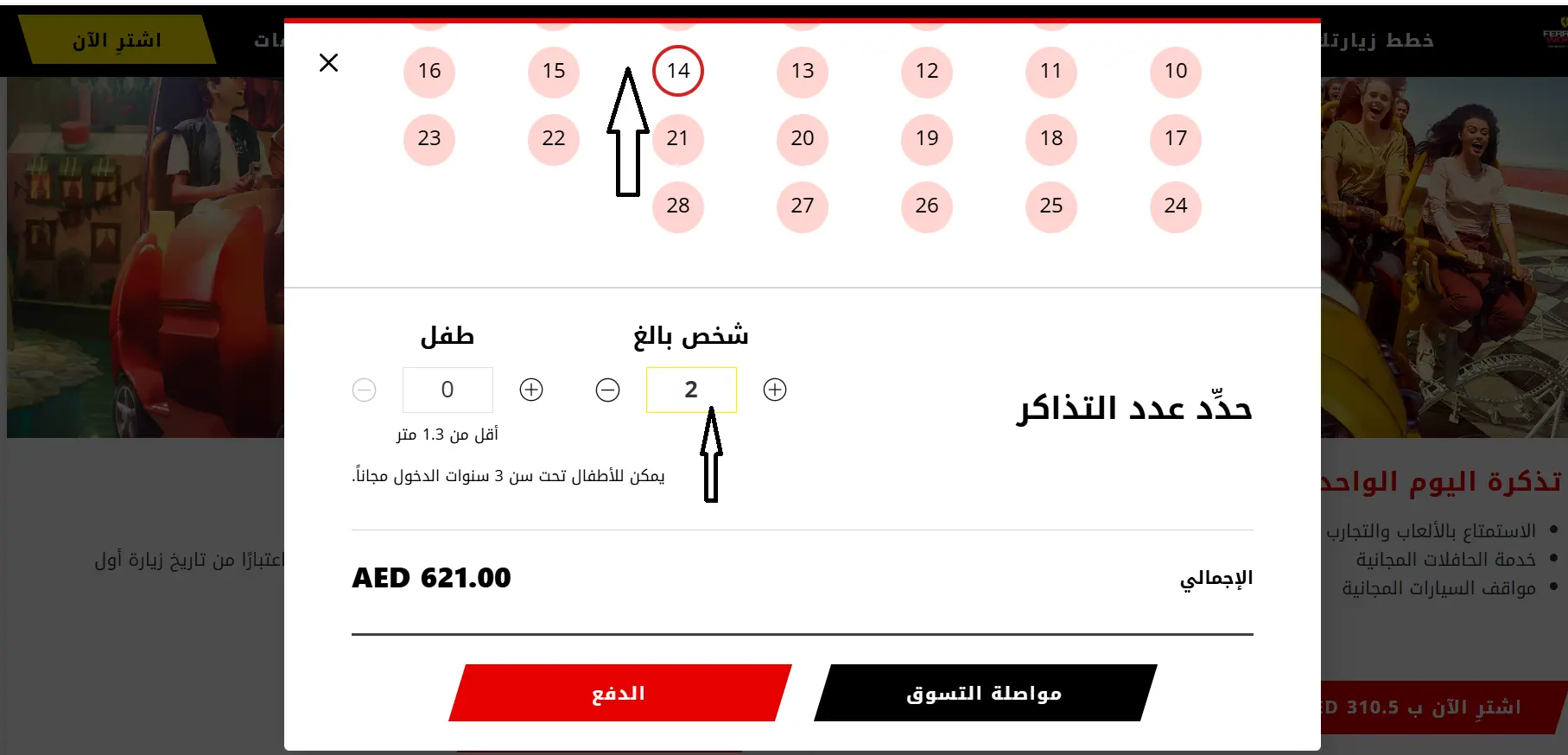 أدخل كود الخصم عند عملية الشراء بعد تحديد كافة البيانات المطلوبة، مثل تحديد تاريخ الزيارة وعدد التذاكر وعدد الأفراد، والانتقال إلى الدفع.
