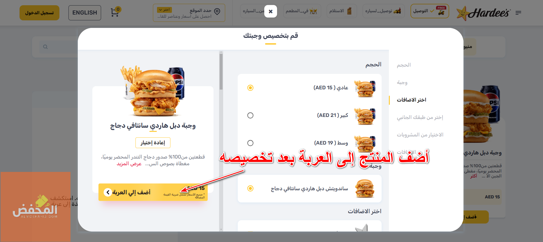 3- اختر الوجبة المرغوبة من بين الوجبات المعروضة على متجر هارديز، ثم قم بالضغط عليها حتى تتمكن من استعراض كافة تفاصيل الطلب، ومن ثم اختيارها للطلب في حال كانت الخيار المناسب.