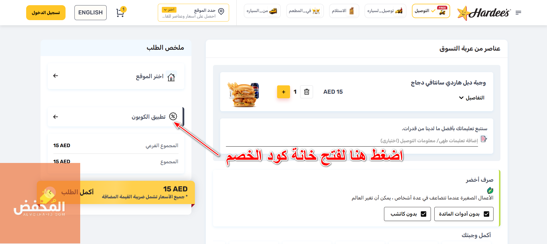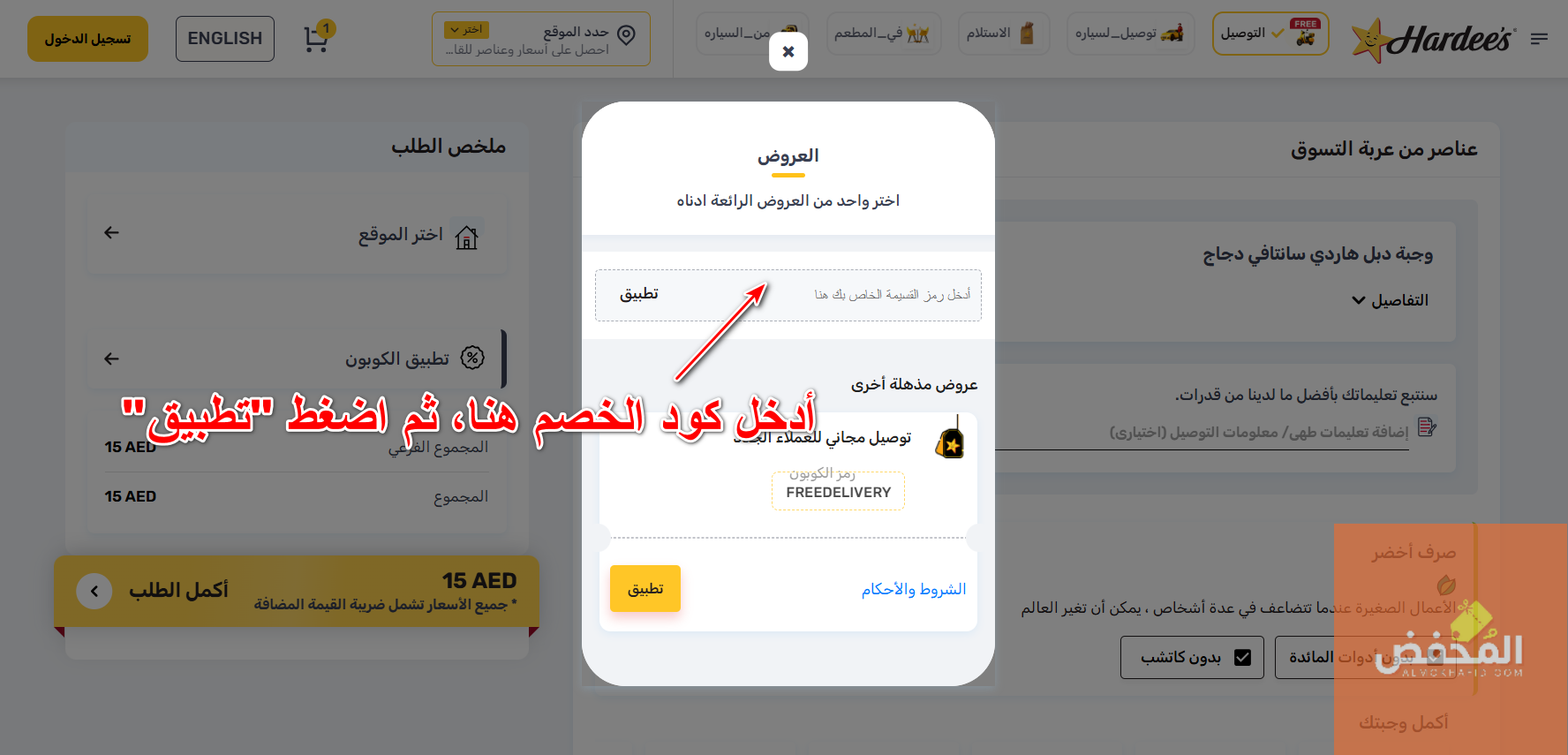 6- انسخ كود خصم Hardees الإمارات والمعروض أعلى هذه المقالة، ثم قم بلصقه في الخانة المشار إليها بالسهم التالي، ثم اضغط “تطبيق” حتى تتمكن من الحصول على الخصم الذي يوفره الكود بشكل فوري.