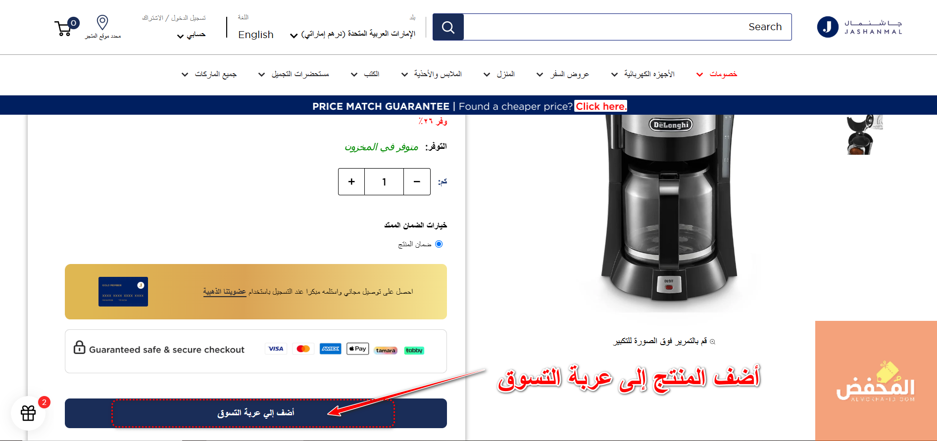 4- أضف المنتج المرغوب إلى عربة التسوق الخاصة بك عن طريق الضغط على الايقونة المشار إليها بالسهم في الصورة التالية، وذلك حتى تتمكن من إتمام طلب الشراء وتطبيق الخصومات لاحقًا من خلالها.