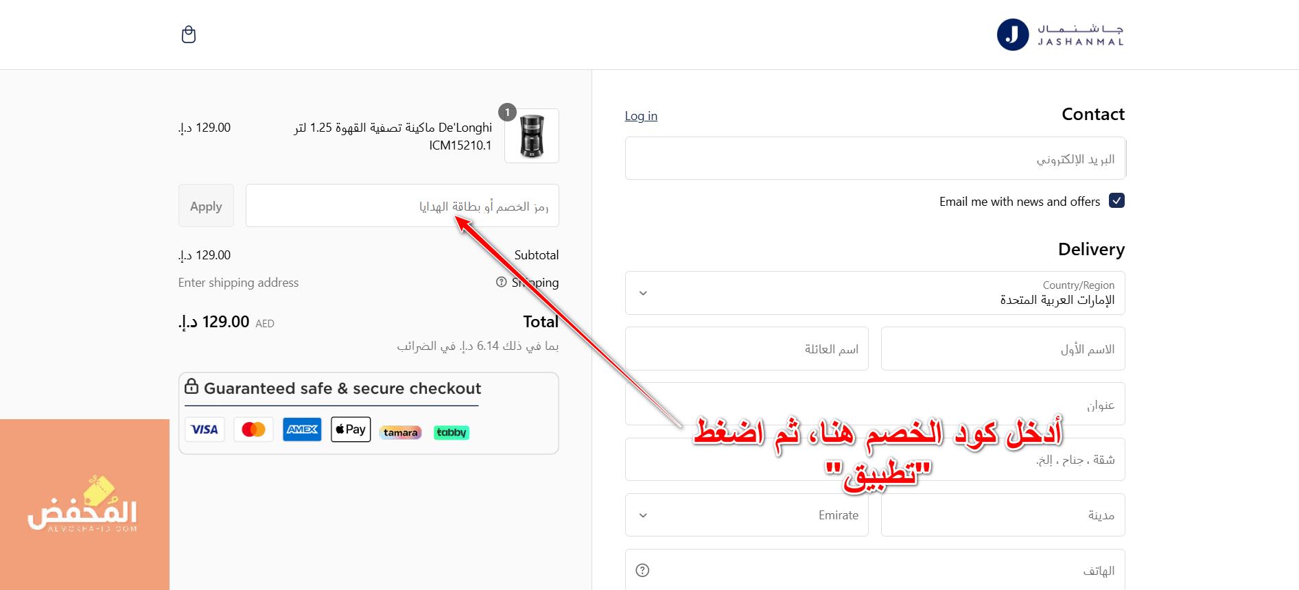 5- انسخ كود خصم جاشنمال الإمارات وقم بلصقه في الخانة المشار إليها بالسهم في الصورة التالية، ثم اضغط “تطبيق” حتى تتمكن من الحصول على الخصم الذي يوفره الكود فورًا وبدون أية صعوبات.