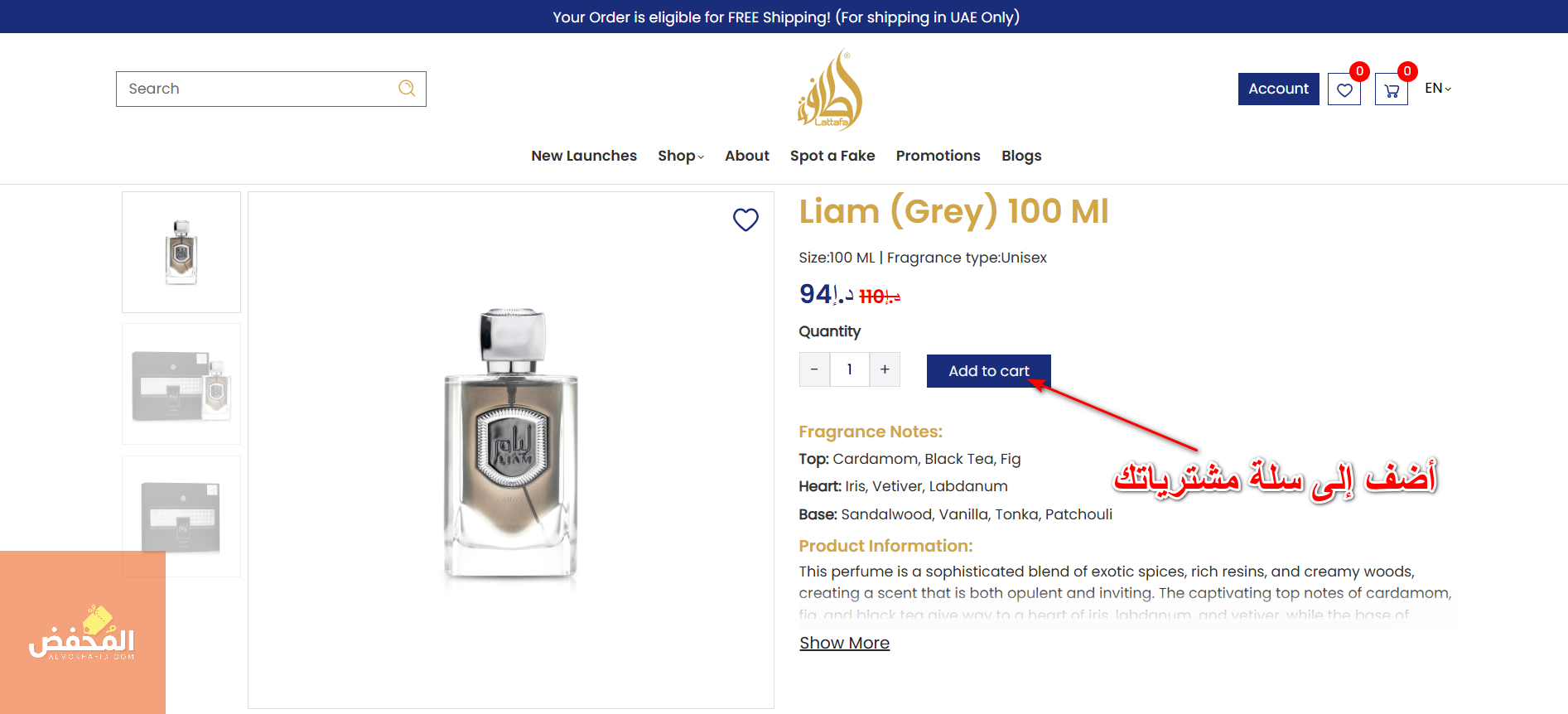 4- أضف المنتج إلى سلة المشتريات الخاصة بك عن طريق الضغط على الأيقونة المشار إليها بالسهم التالي، حتى تتمكن من إتمام عملية الشراء من خلال سلة المشتريات تلك.