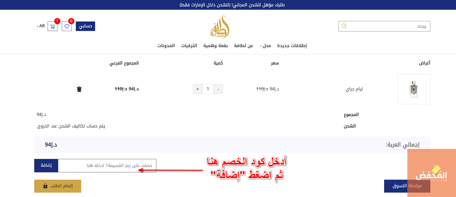 5- انسخ كود خصم لطافة الإمارات ، ثم قم بلصقه في الخانة المحددة والمشار إليها بالسهم، ثم اضغط على “إضافة” حتى تتمكن من الحصول على الخصومات المتوفرة بشكل فوري وسريع.