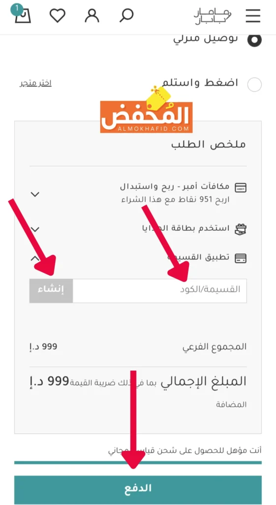 3. اضغط على تطبيق القسيمة وادخل كود الخصم، ثم اضغط إنشاء.