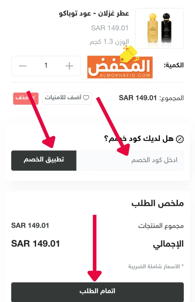 3. ادخل كود الخصم المتاح في موقع المُخفض، ثم اضغط تطبيق الخصم للحصول على نسبة التخفيض على إجمالي فاتورتك الشرائية.