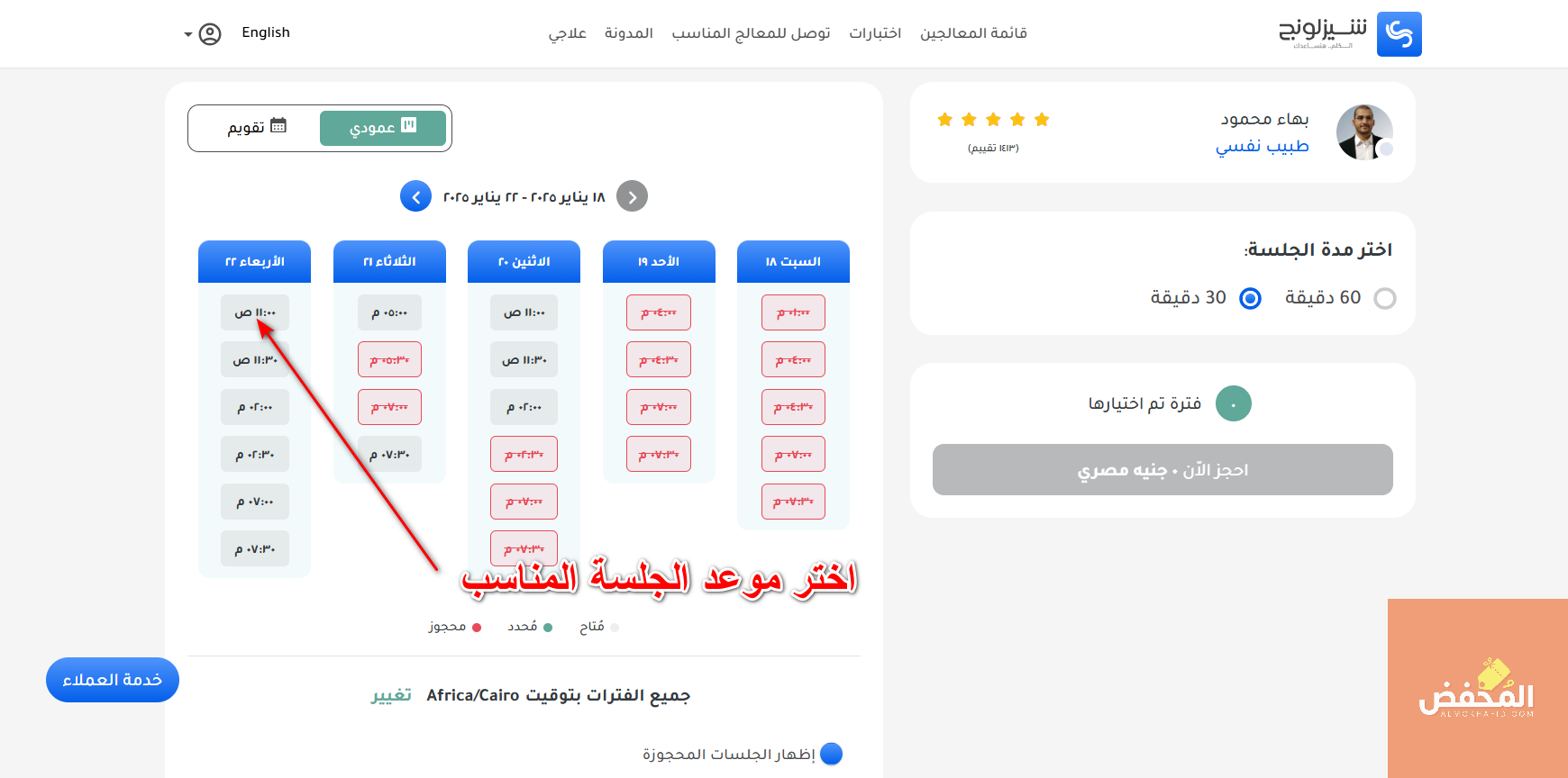 5- اختر موعد الجلسة المناسب باليوم والساعة، ثم قم بالضغط على “احجز الآن” حتى تتمكن من تأكيد الحجز واختيار الموعد بشكل سليم.