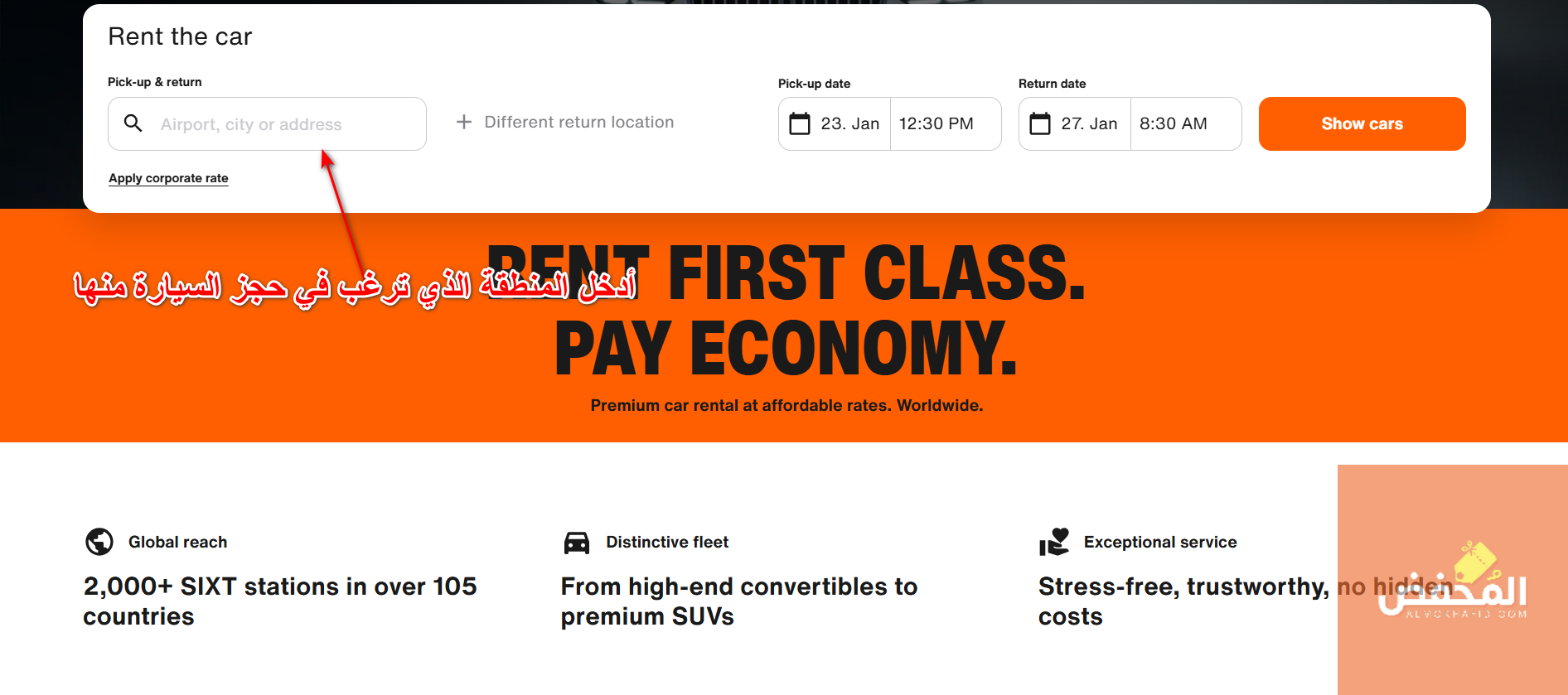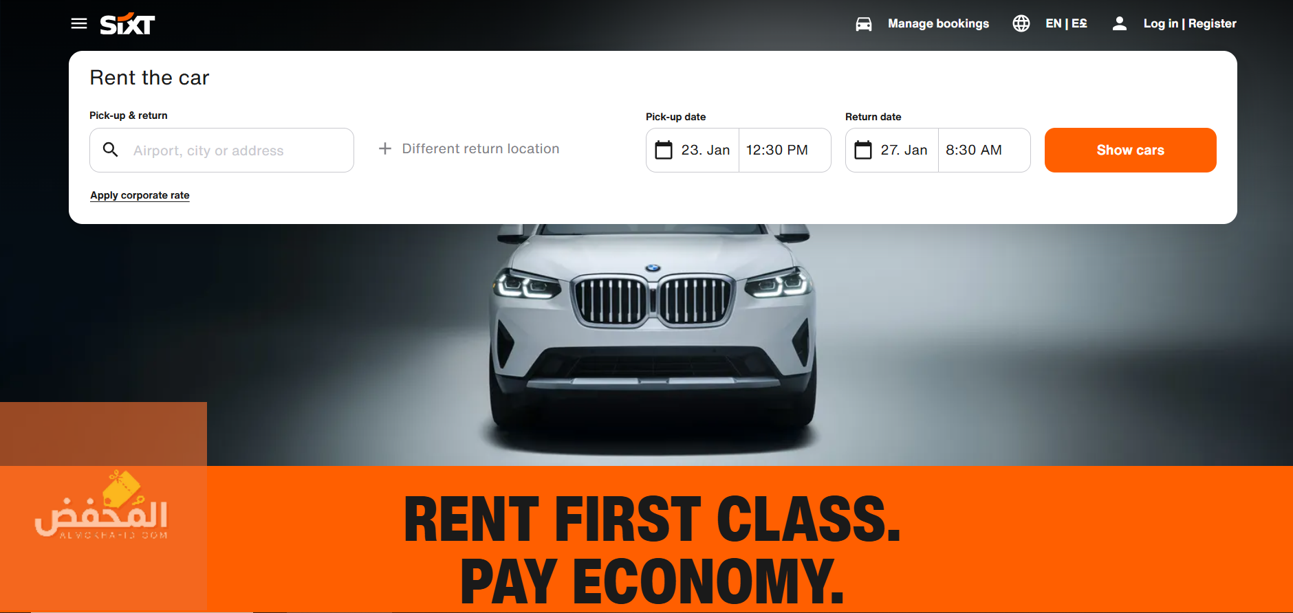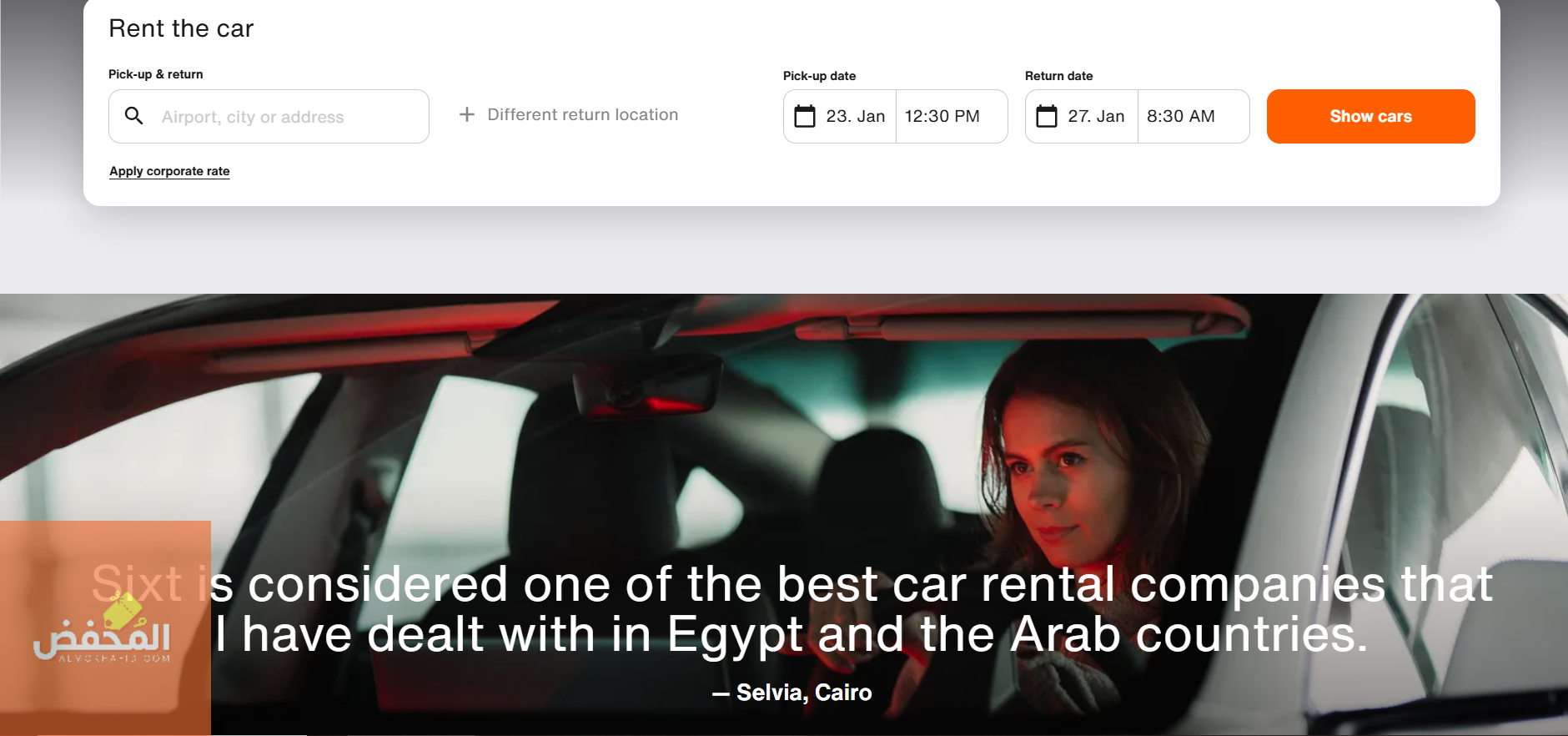 1- ادخل إلى الموقع الرسمي لمنصة SIXT الإمارات عن طريق الرابط المباشر الخاص بالموقع، والذي نعرضه أعلى هذه المقالة، إذ يمكن من خلال هذه الرابط استعراض كافة السيارات، والخدمات المميزة التي يوفرها الموقع.