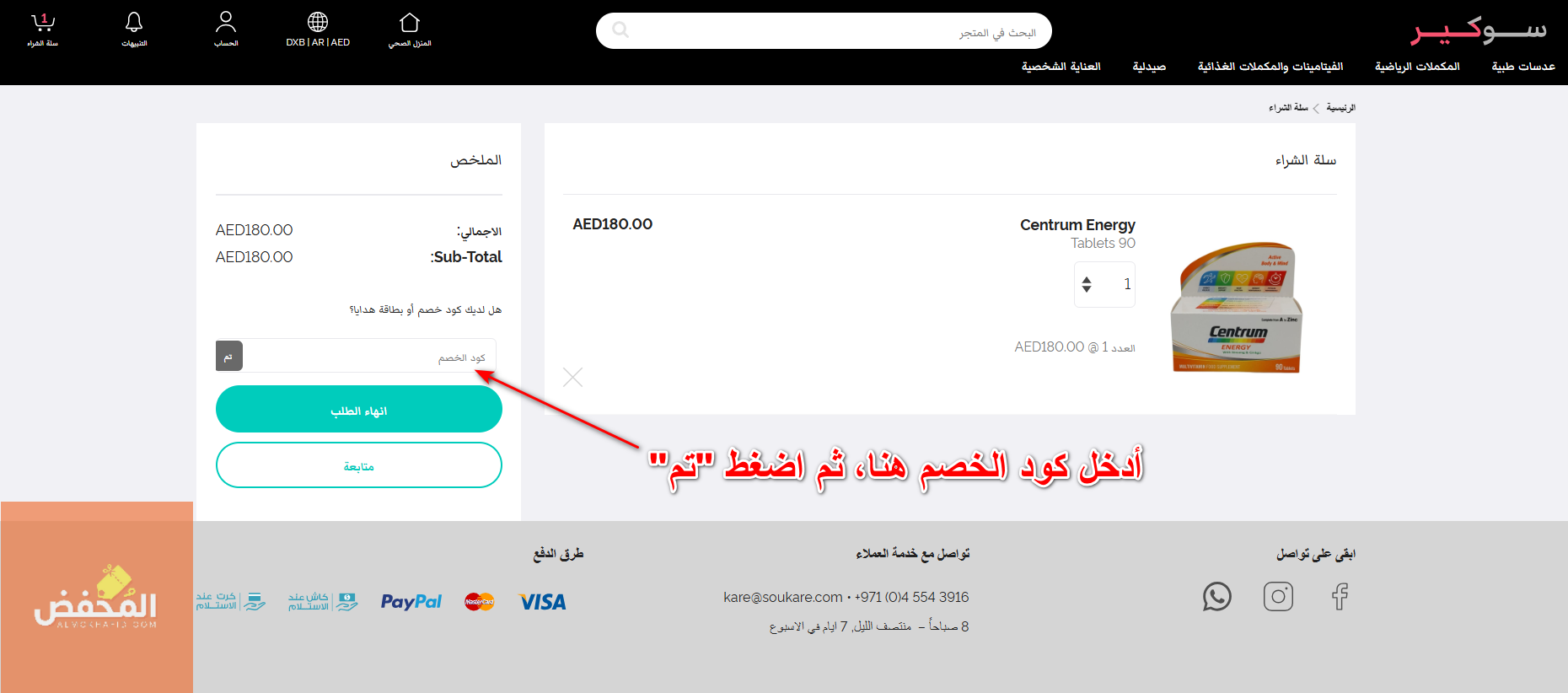 5- انسخ كود خصم سوكير الإمارات من أعلى هذه الصفحة، ثم قم بلصقه في الخانة المحددة والمشار إليها بالصورة التالية، ثم اضغط على “تم” حتى تتمكن من تطبيق الكود فورًا والحصول على الخصم المميز الذي يوفره المتجر.