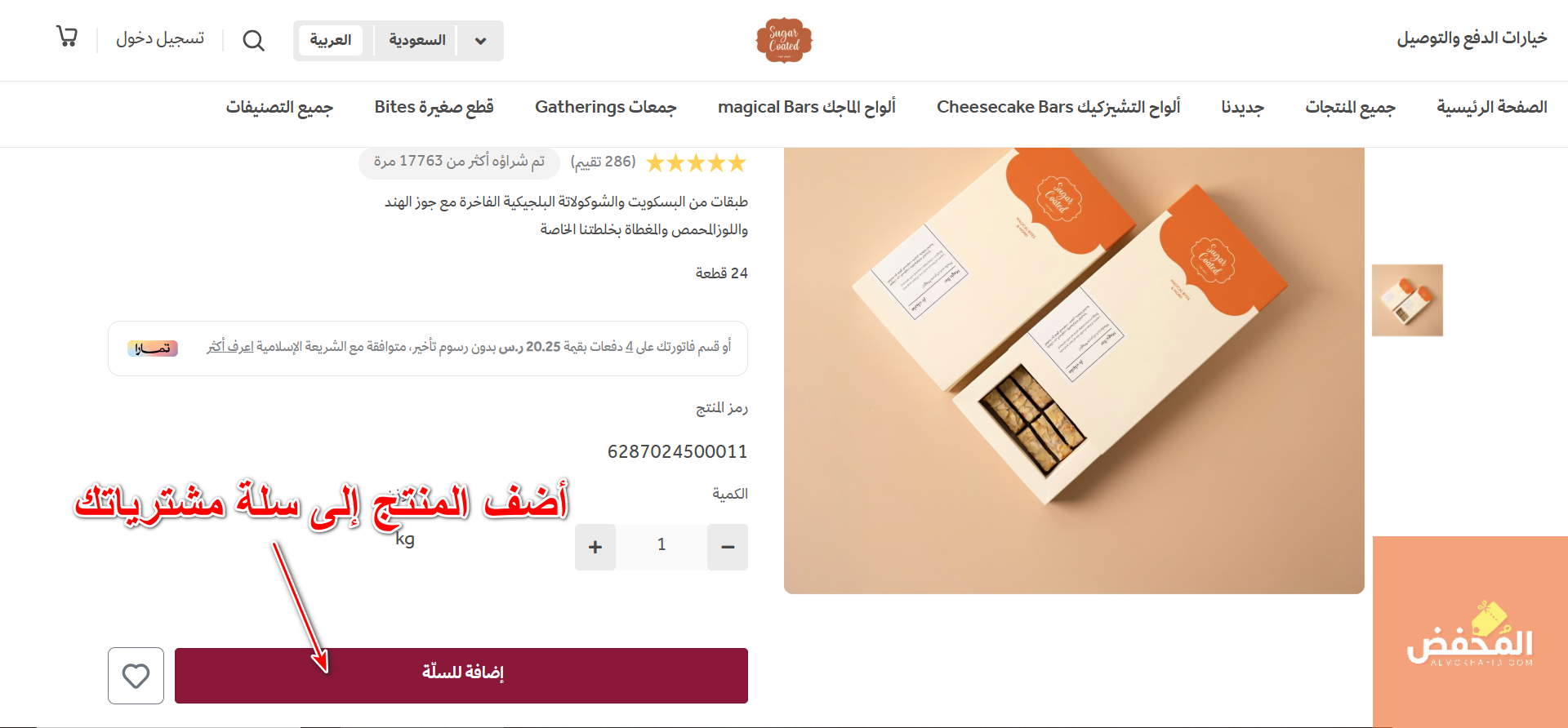 4- أضف المنتج إلى سلة المشتريات الخاصة بك عن طريق الضغط على الأيقونة المشار إليها بالسهم التالي، وذلك حتى تتمكن من استعراض الطلب الخاص بك، وتطبيق كود الخصم من خلال سلة المشتريات هذه.