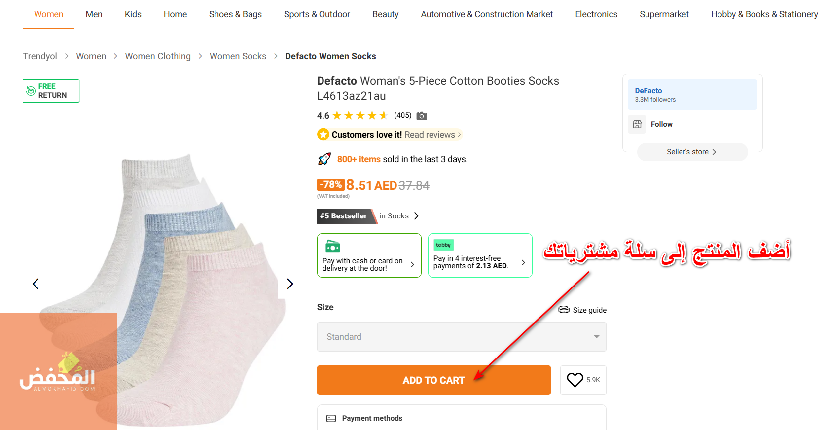 4- أضف المنتج إلى سلة المشتريات الخاصة بك عن طريق الضغط على الأيقونة المشار إليها بالسهم في الصورة التالية: