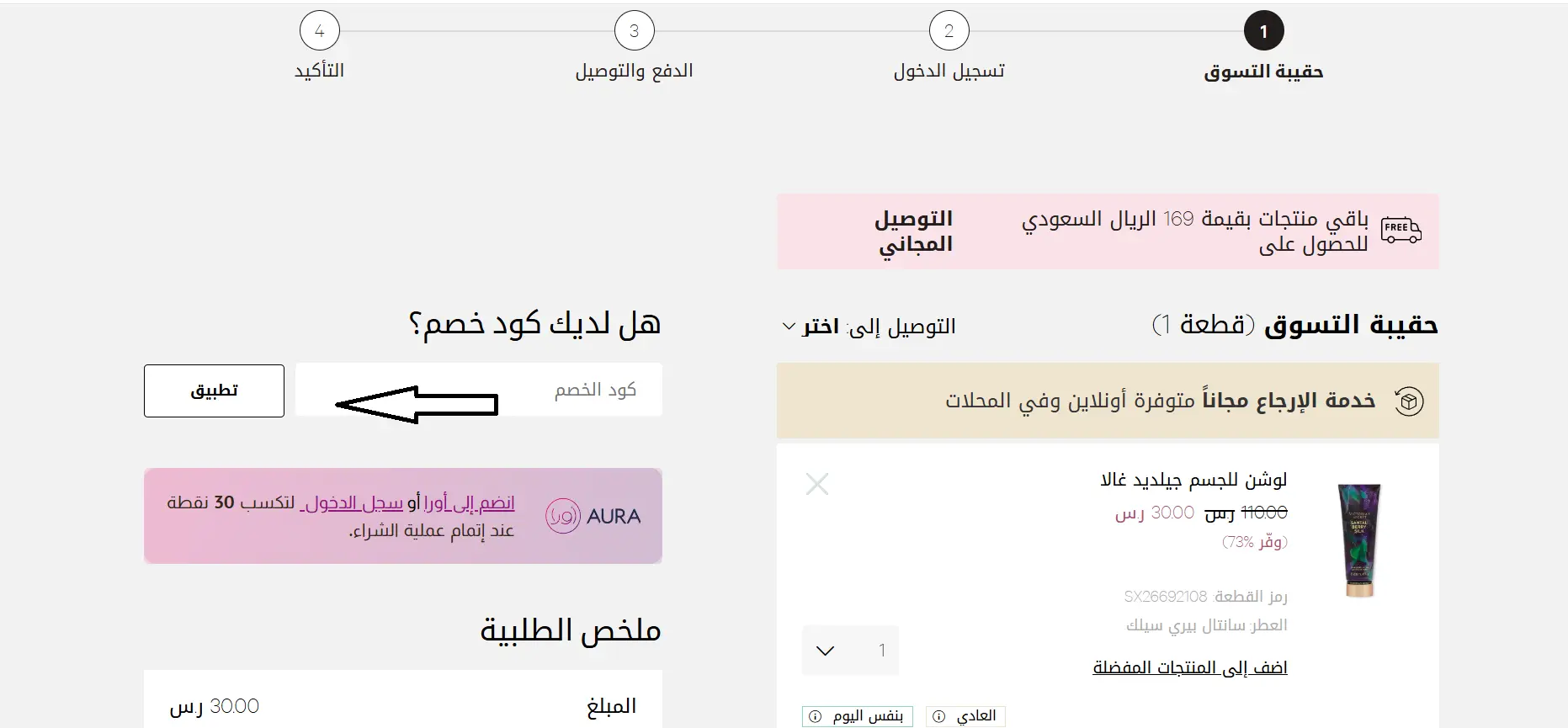 استكمل الشراء عن طريق إدخال كود الخصم في الخانة المخصصة للحصول على التخفيضات.