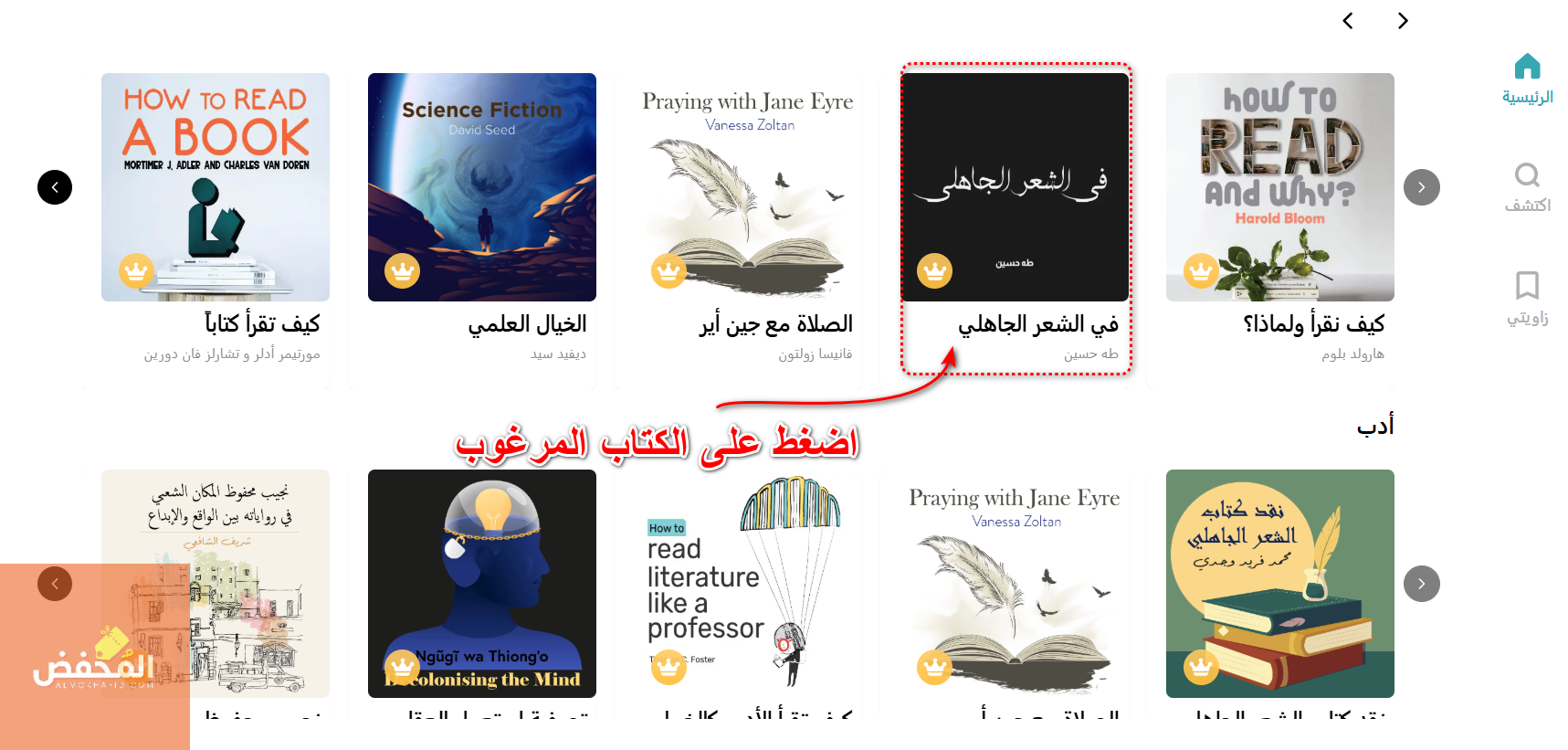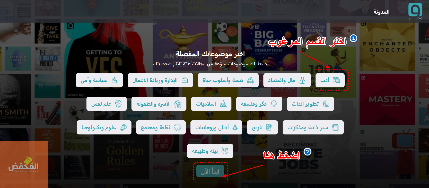 2- اختر الفئة أو القسم المرغوب من بين الفئات المعروضة، ثم اضغط على “ابدأ” حتى تتمكن من استعراض الأعمال الأدبية المعروضة ضمن هذا التصنيف.
