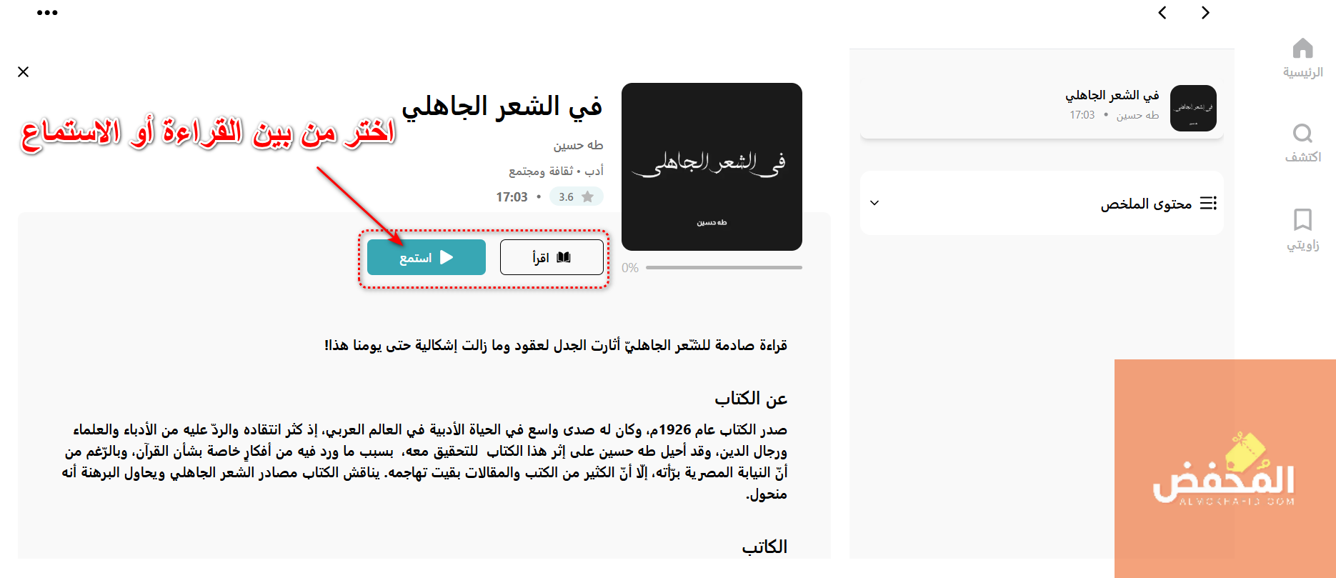 4- اختر من بين القراءة أو الاستماع إلى النسخة المجانية لأخذ فكرة عن مدى جودة الكتب الصوتية المعروضة على المنصة، ومن ثم أخذ قرار الاشتراك فيها أم لا.